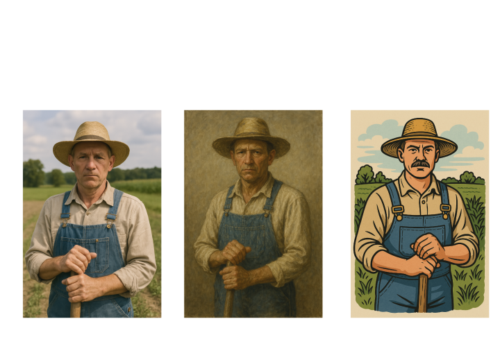 Hieronder 3 keer dezelfde boer. Toch zijn de afbeeldingen anders. Wat zou per afbeelding de prompt kunnen zijn geweest?